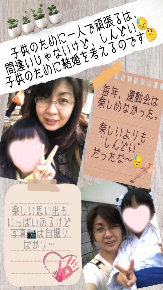 子供さんの人数、性別、性格も様々です。子供に対して罪悪感のようなものもあります。自分の張り詰めたものが“ぷつっ”と切れてしまう前に“婚活”考えてみませんか?